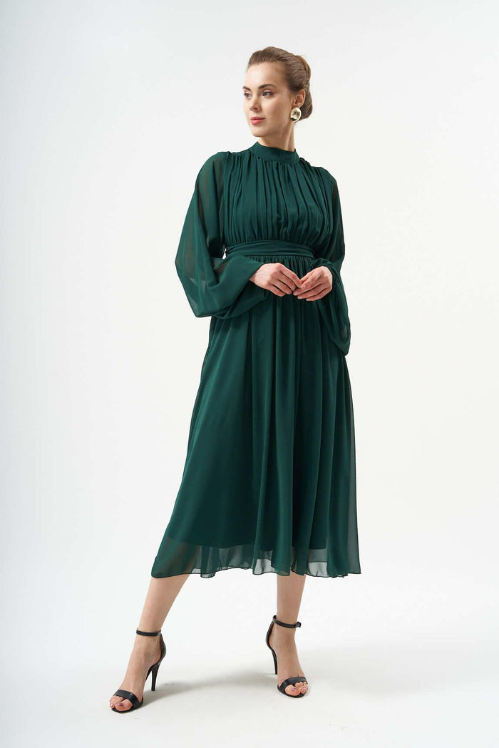 The design features a modest high-collar neckline and a delicately pleated bodice that leads into a wide, defining waistband. The highlight of this piece is the sheer, billowy sleeves that add an airy, romantic touch, while the flowing skirt ends in a translucent hemline, creating a beautiful sense of depth and movement.