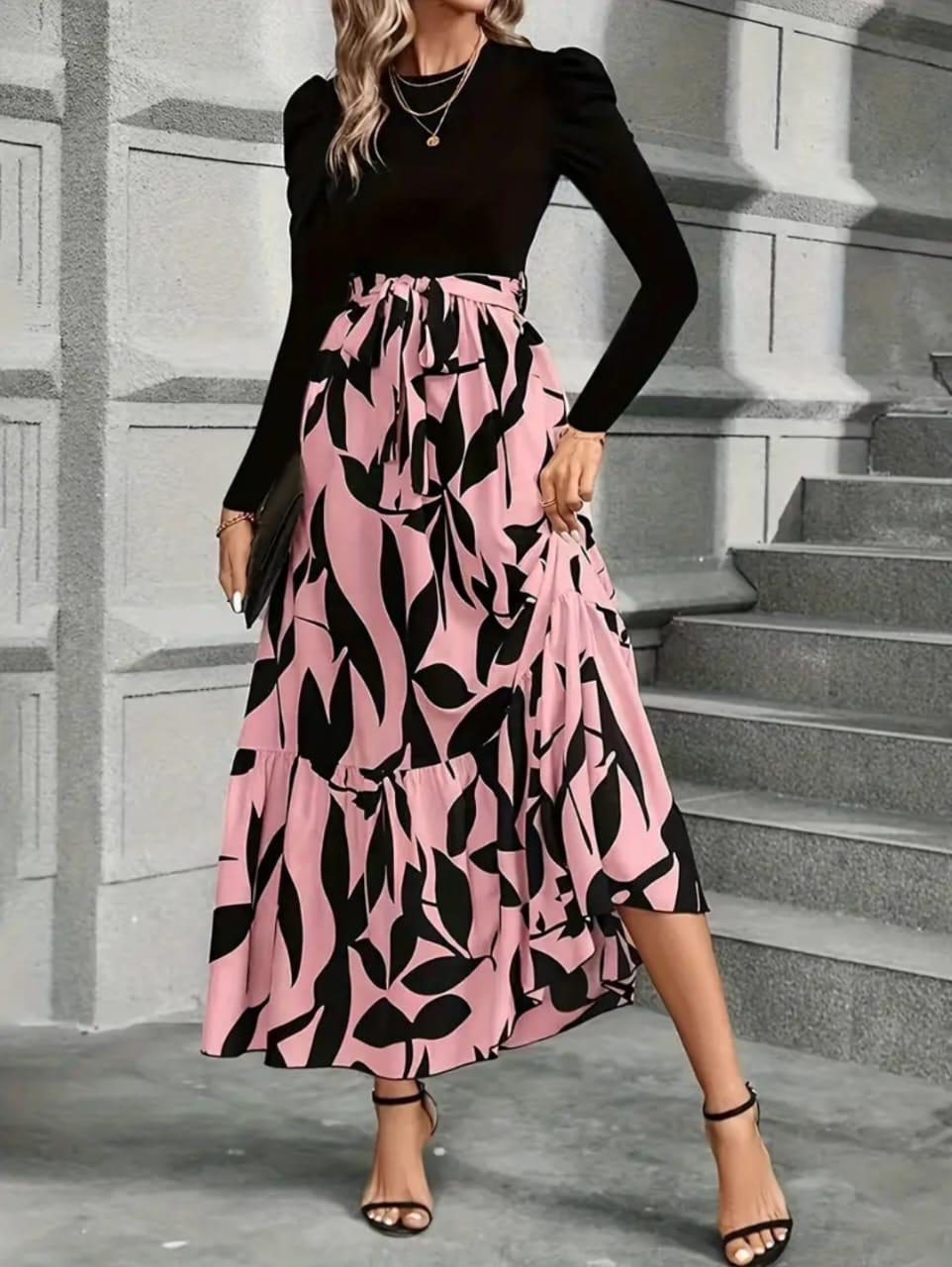 This outfit is a striking example of modern romanticism, utilizing bold botanical patterns and structural silhouettes to create a look that is both dramatic and classically feminine. The upper portion consists of a sleek, form-fitting black bodysuit or top featuring a modest crew neckline and long, slim-fit sleeves. The defining feature of the top is the dramatic puff shoulders, which add a structural, Victorian-inspired volume that balances the narrowness of the sleeves and torso. This solid dark base serves as a neutral anchor for the more expressive lower half of the ensemble.