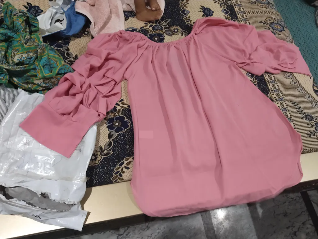 Crafted from a premium, lightweight fabric, the material features a subtle micro-shimmer that creates a luminous glow when it catches the light. The design centers around a graceful, gathered neckline that flows into an airy, relaxed silhouette, offering both comfort and elegance.
