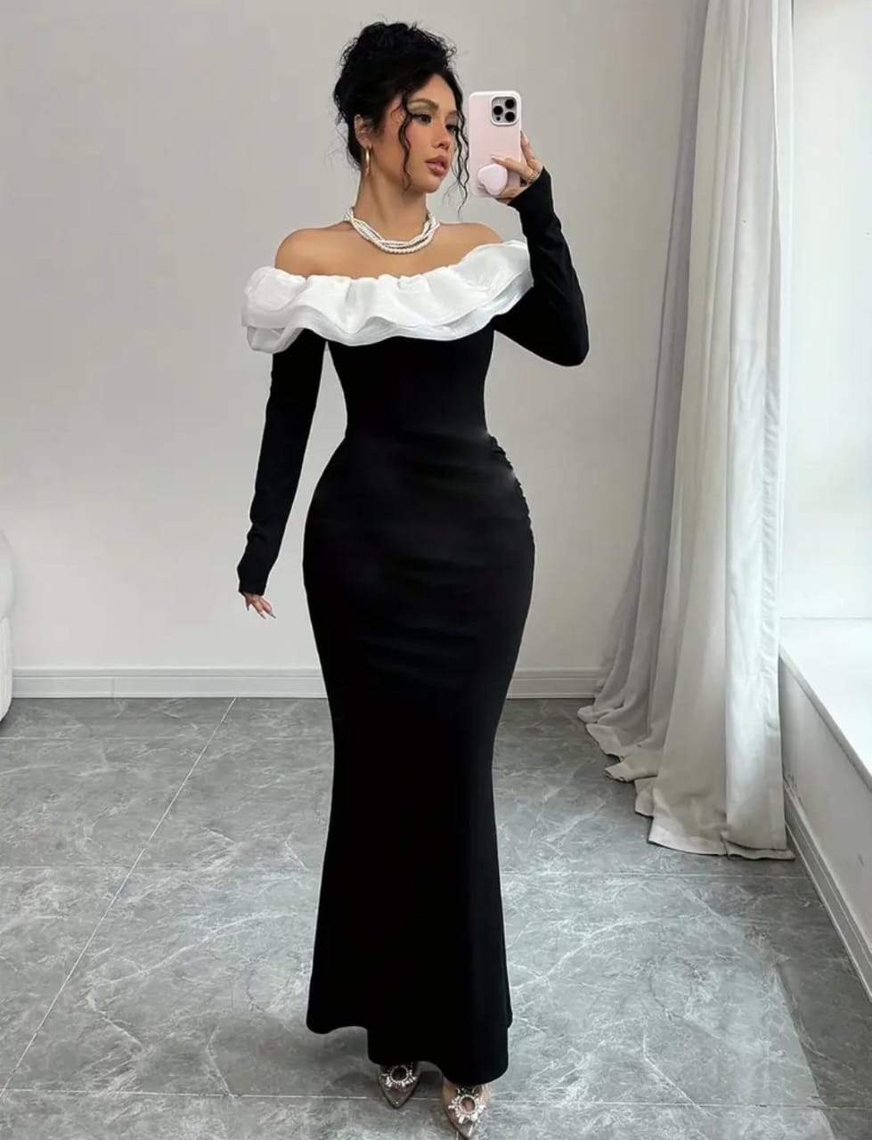 Make a dramatic entrance in this couture-inspired gown. A sharp contrast of black and white draws the eye, with the voluminous ruffle framing your shoulders like a crown. The sculpted fit enhances your hourglass figure, creating a statuesque, unforgettable silhouette.