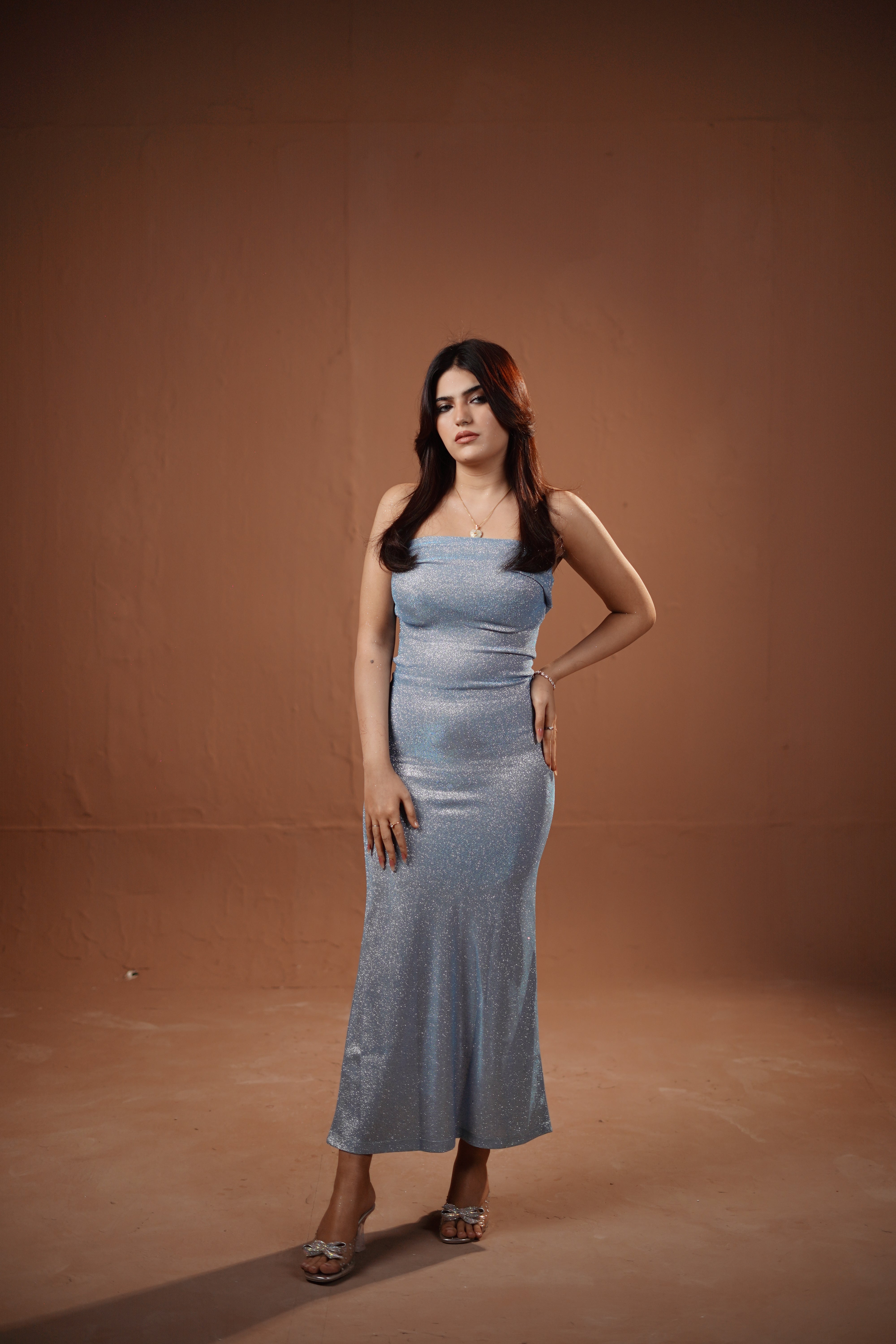 Channel ethereal, "Mermaidcore" beauty with this captivating Frozen Starlight Bodycon . Constructed from a unique, glitter-infused fabric, the dress offers a "liquid stardust" effect that catches and reflects light with every movement. The bandeau-style bodice hugs the figure through the hips before cascading into a graceful floor-length finish. Its cool-toned azure hue provides a refreshing alternative to traditional evening wear, making it a perfect choice for red-carpet events, proms, or winter galas where a light-catching, shimmering presence is desired.