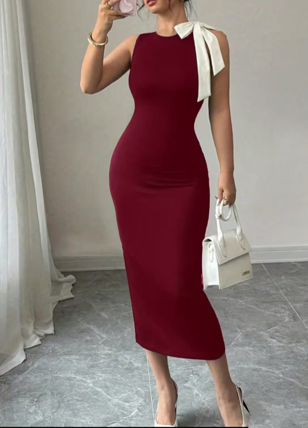 Channel timeless Mediterranean elegance. With its classic round neckline and sculptural knot detail, this dress captures the essence of French style. The streamlined cut celebrates your natural silhouette, while the contrasting bow adds a touch of whimsical charm. Elegant, refined, and undeniably chic—it is the quintessential 'hero' piece for your wardrobe.